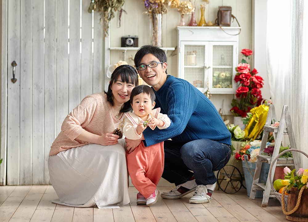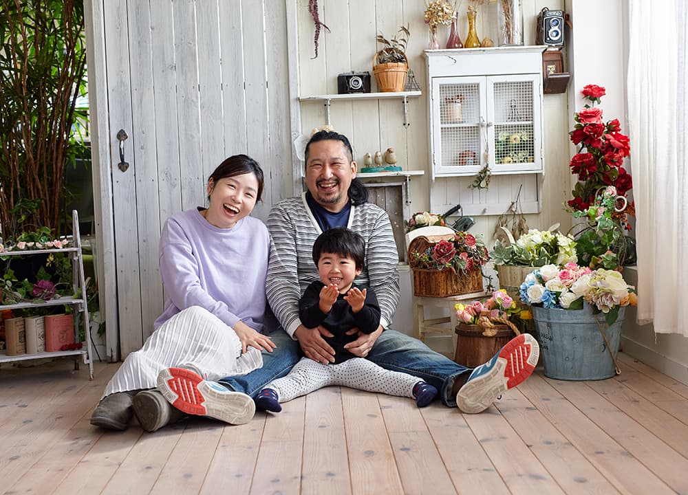 市川写真館の自然光が降り注ぐ撮影スペースと本格的なスタジオでカジュアルな雰囲気の写真をたくさん撮影いたします。